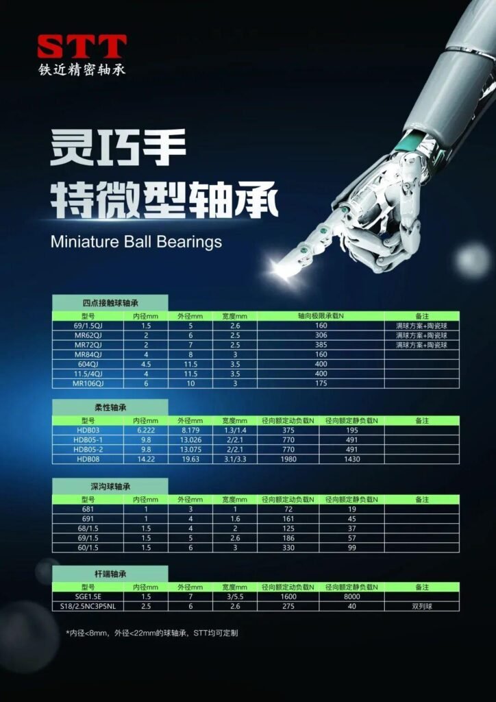 In the emerging market of humanoid robots, dexterous hands are the main development direction for Suzhou Tiejin. The current product matrix includes: 03/05 series miniature harmonic reducer flexible bearings, four-point contact bearings with an inner diameter of 1.5~6mm for bearing the axial force of miniature screws, linear actuator rod end fisheye bearings, and 1x3x1 deep groove ball bearings for hollow cup motors.