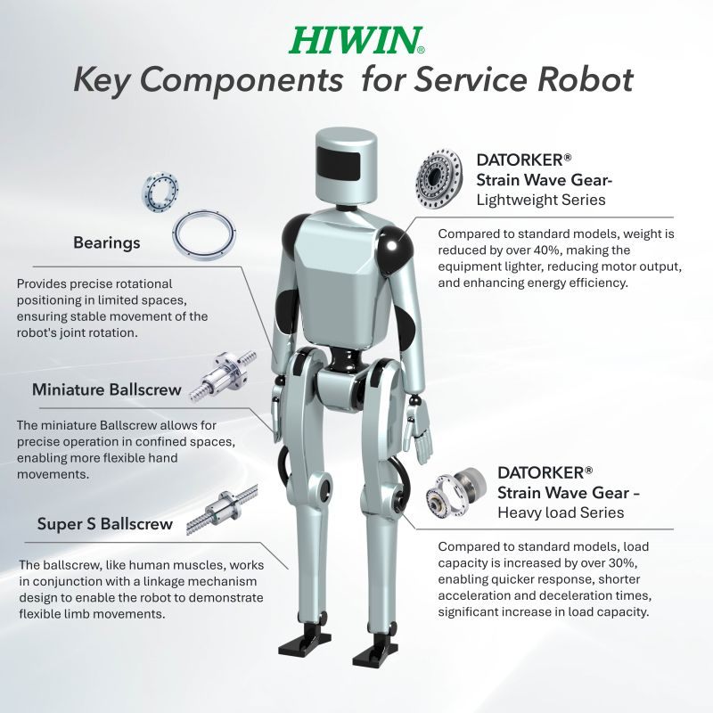 HIWIN provides key component solutions for humanoid robots, including precision ball screws, lightweight harmonic gear reducers, and ultra-thin crossed roller bearings, ensuring humanoid robots achieve extremely lightweight structures and precise, stable operation.