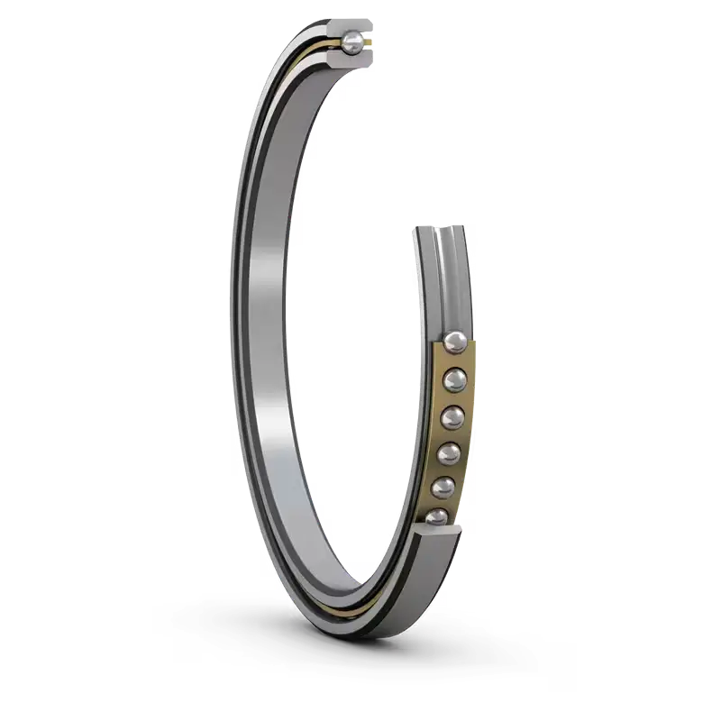 Four-Point Contact Bearings are radial single-row angular contact ball bearings. Their raceways are designed to support axial loads acting in two directions. They are a solution that combines versatility, compactness, and cost-effectiveness. Some models use a split inner or outer ring design to increase the contact angle for withstanding higher axial forces and moment loads. They are commonly used as input bearings for rotary actuators.